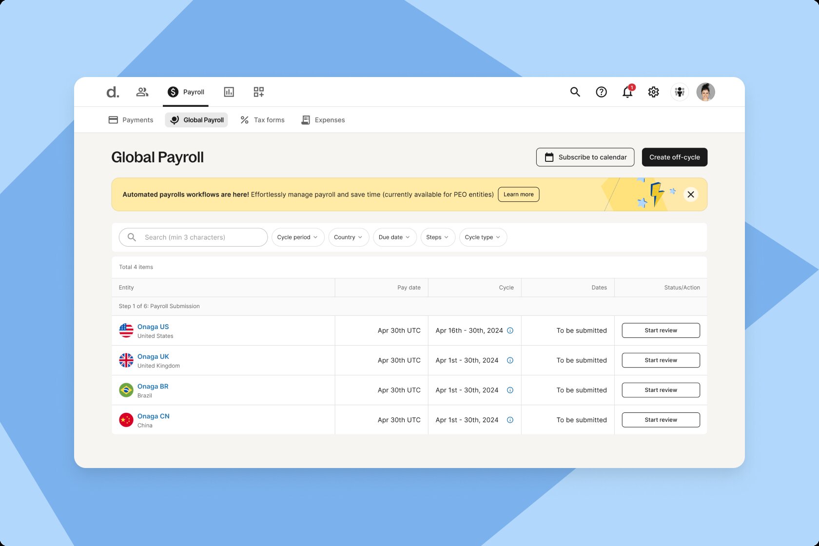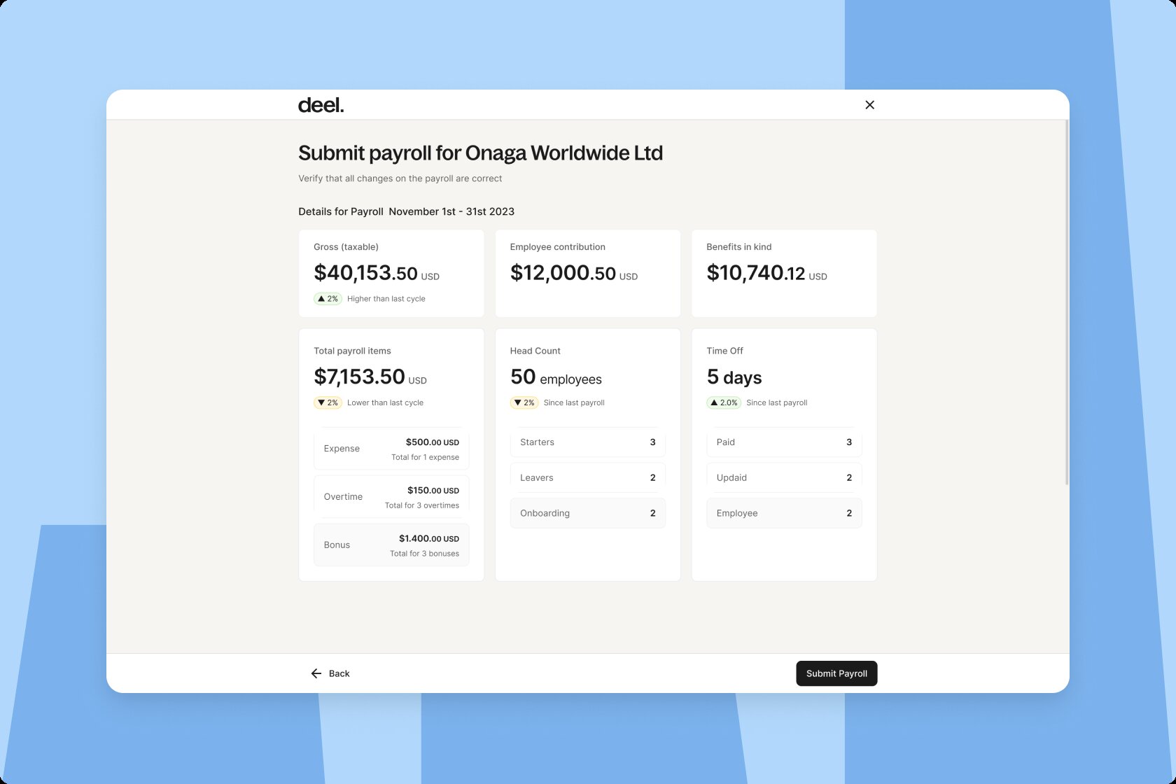 Deel Payroll allows companies to run payroll globally or locally across all worker types from a single system.
