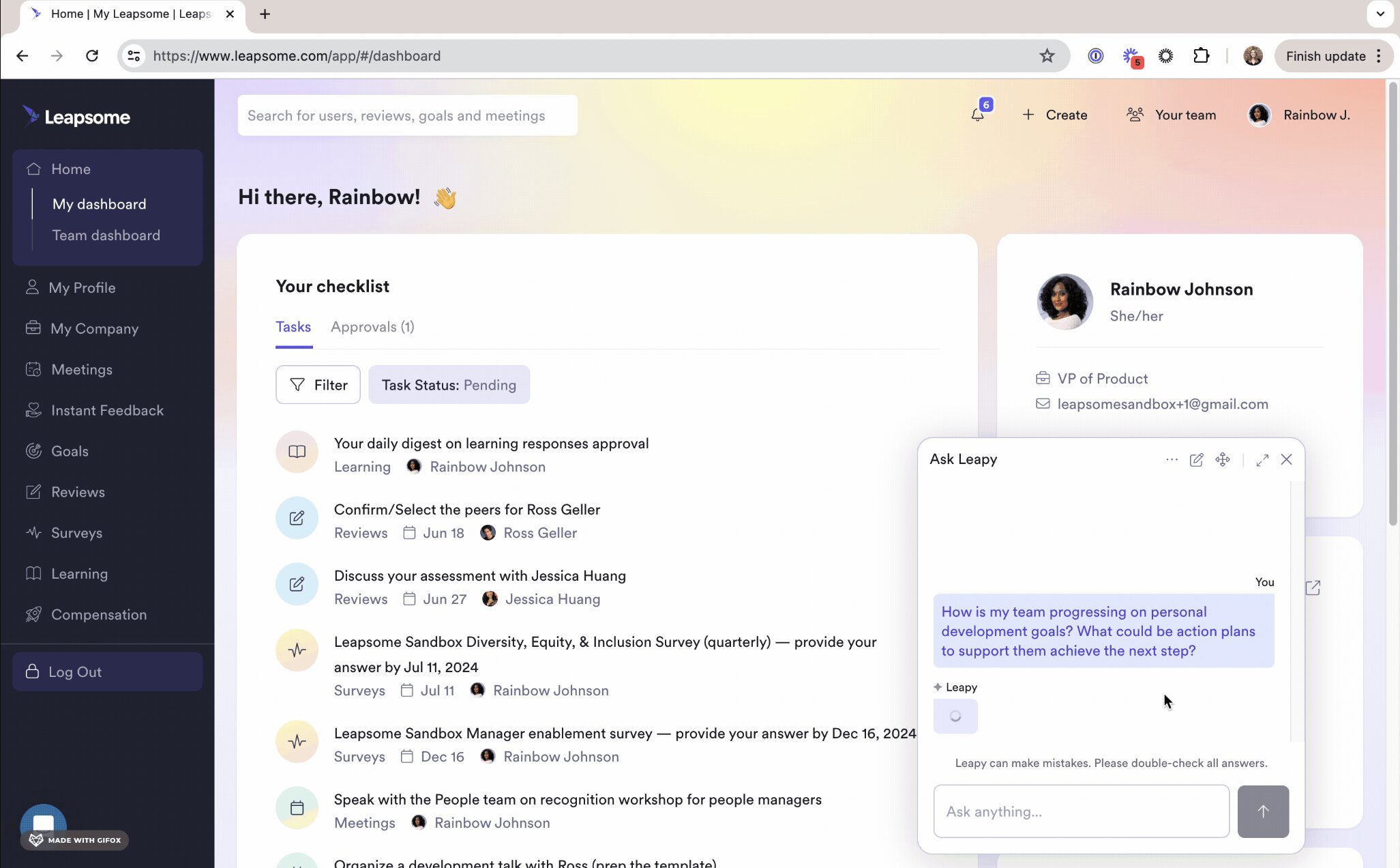 - AI Copilot (Leapy): Leapsome’s AI copilot answers questions about workflows, suggests next steps, and provides contextual guidance to managers and employees based on their role and data stored in the system.