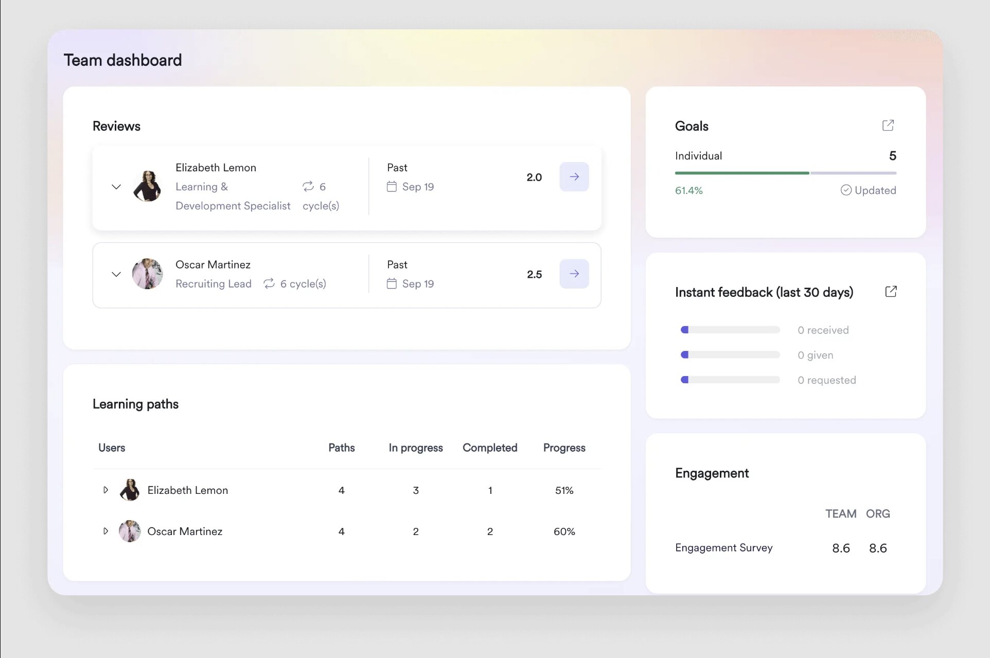 - Goals and development: Goal setting and development planning are integrated with feedback and reviews. This allows managers to link performance discussions with longer-term growth plans, rather than treating them as separate processes.