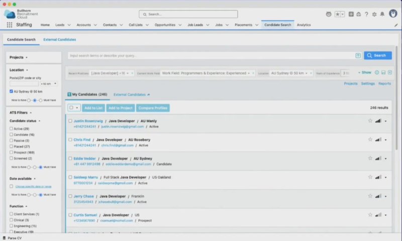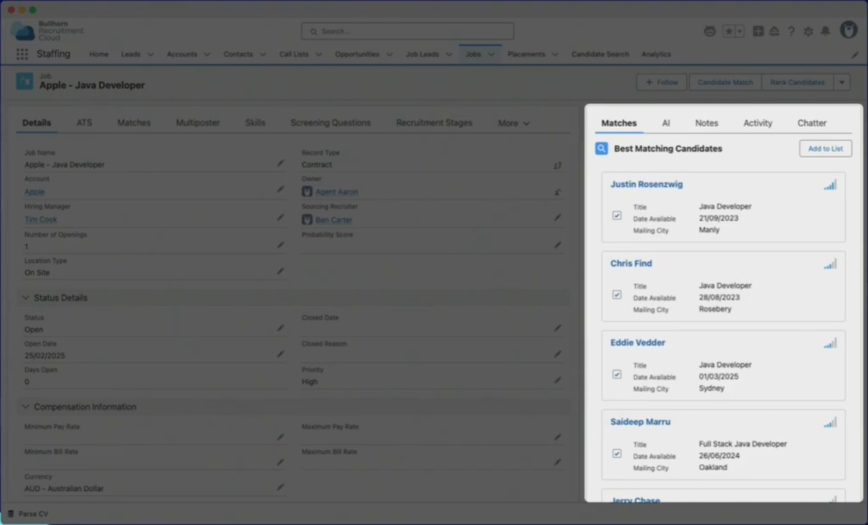 Unlike Bullhorn’s Applicant Tracking & CRM, which helps track candidates, manage jobs, and keep client relationships in one system, Bullhorn Recruitment Cloud integrates Salesforce tools, custom objects, and extensions with Recruitment Cloud workflows to support complex sales and recruitment processes.