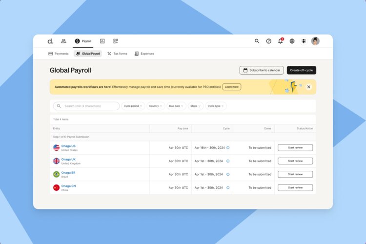 Deel Payroll allows companies to run payroll globally or locally across all worker types from a single system.
