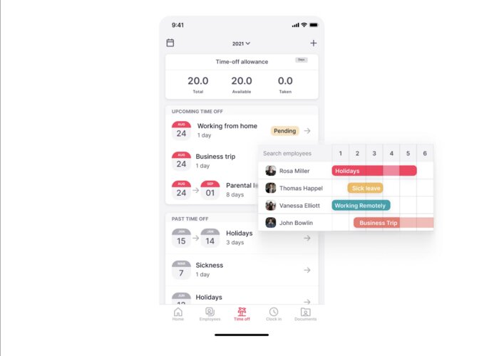 The software includes tools for time tracking and leave management, allowing employees to clock in, request time off, and view balances without HR intervention.