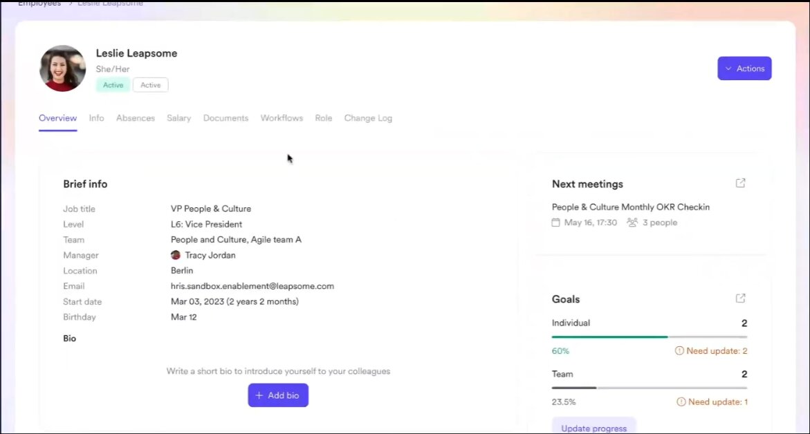 Leapsome is an HRIS and employee management platform designed to support performance development, structured feedback, and ongoing manager-employee conversations.