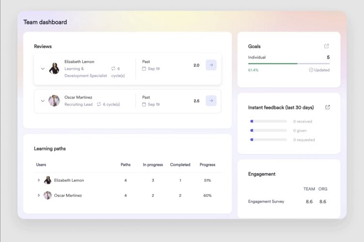 It combines several employee feedback tools including reviews, 1:1s, surveys, and goal tracking, to reduce fragmentation across HR workflows.