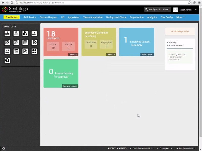 An overview of HR software features can be viewed on the Sentrifugo HRMS central dashboard, this page offers overall information at a glance. HR modules can be downloaded as and when they are required, meaning that companies can expand their HR functionality when it suits them, rather than having to invest time and money upfront for features that are not immediately required.