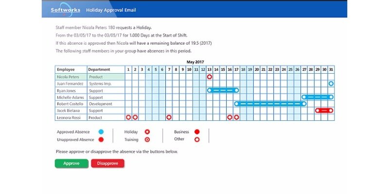 Softworks Workforce Management's employee self-service enables employees to access real-time workflow information such as their rosters, holiday balances, and absence figures. This self-service portal can be simplified for those employees who don’t have regular access to a computer or have low levels of training in HR software.